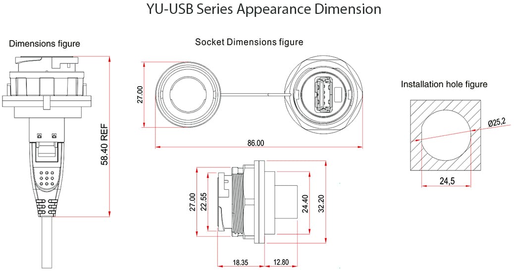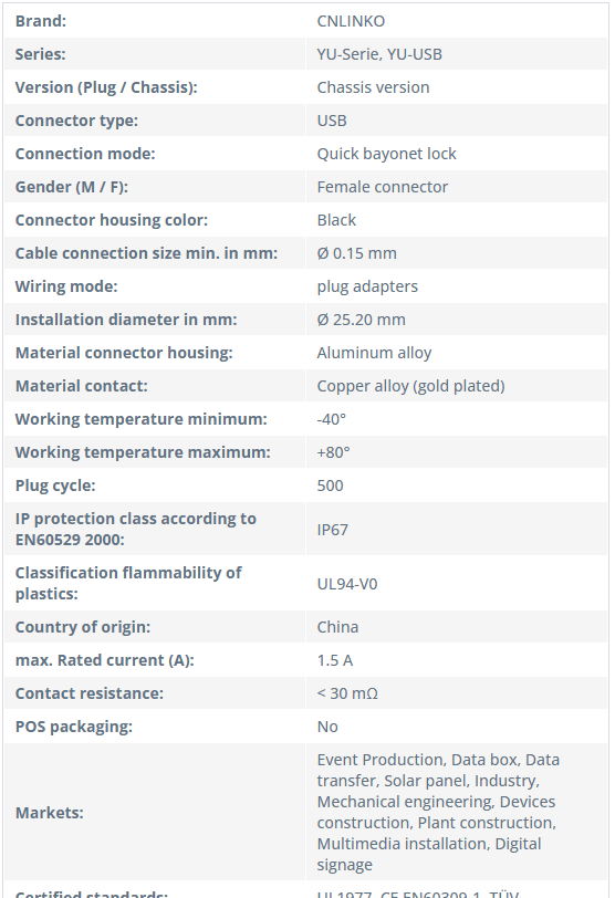 The Cnlinko YU-USB3-FS-MP-1M-001 is a USB 3.0 male plug with female socket and 1 meter of cable. Rated for 1.5A. Bayonet connection on socket. Designed to operate under harsh conditions. Used to send data inside the machine, as the socket can be mounted outside. Compatible with USB 2.0. Socket includes cap. Also known as YU-USB3-JSX-03-100